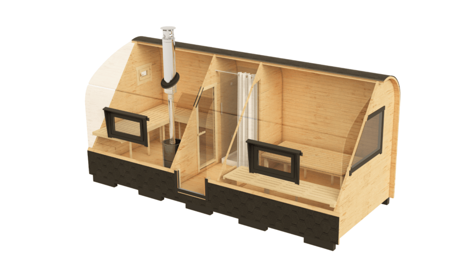Баня Би-хаус имеет три помещения. В данной модели Вы можете организовать полноценное помывочное отделение. За счет формы баня обеспечит быстрый прогрев помещений даже зимой. Баня устанавливается бригадой сборщиков за один день.